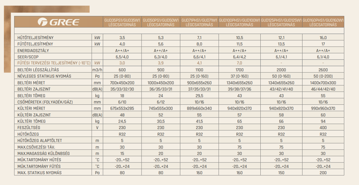 A Gree GUD50PS / GUD50W Légcsatornás Split Klíma fontos tulajdonságai: