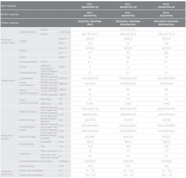 A Midea MTJ-36HWFNX-SP légcsatornázható split (R32, 10,6 kW) fontos tulajdonságai: